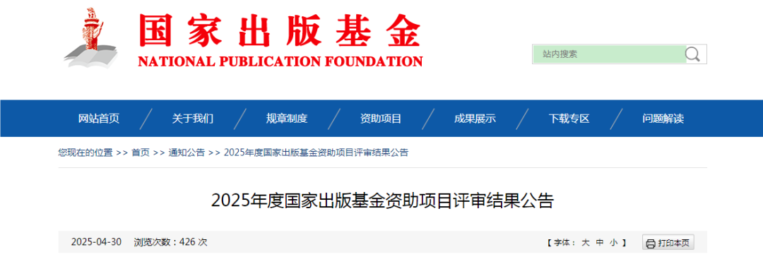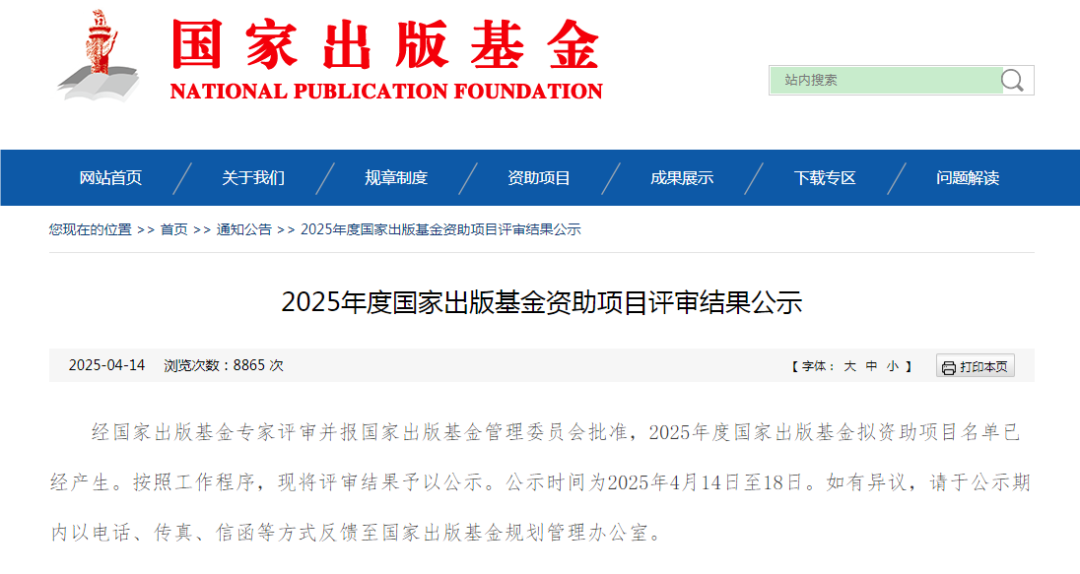 2025年4月14日,国家出版基金规划管理办公室公布2025年度国家出版基金资助项目评审结果公示,4月30日发布了评审结果公告。